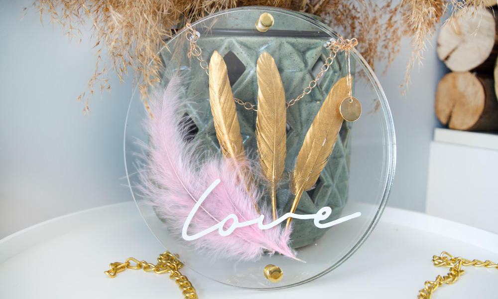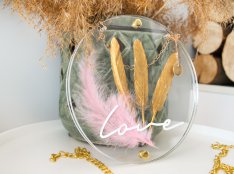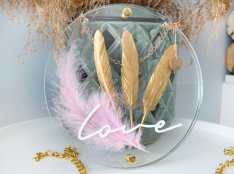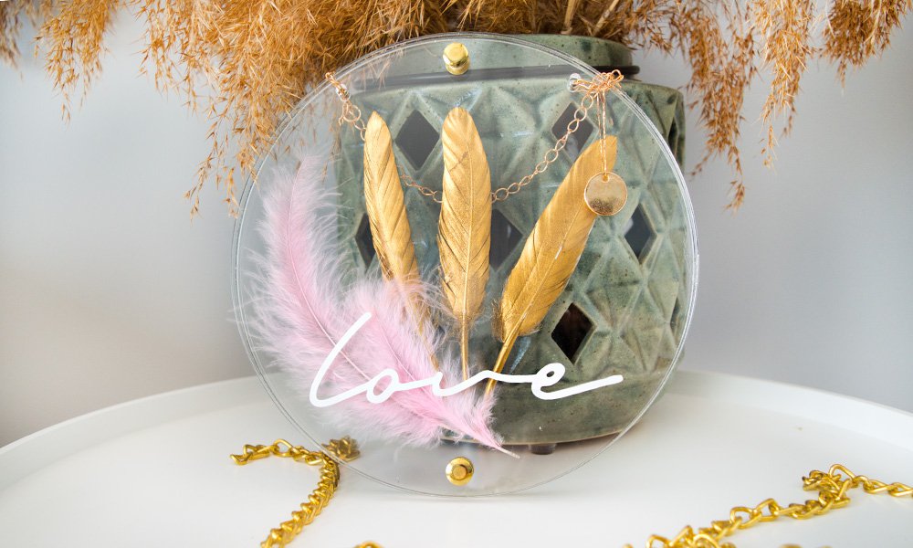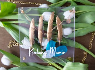 Delikatne piórka uchwycone w akrylowej ramce zawieszone na złotym łańcuszku to nasza propozycja prezentu.