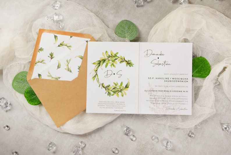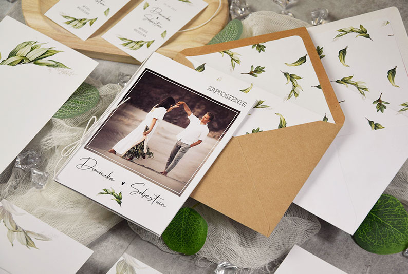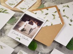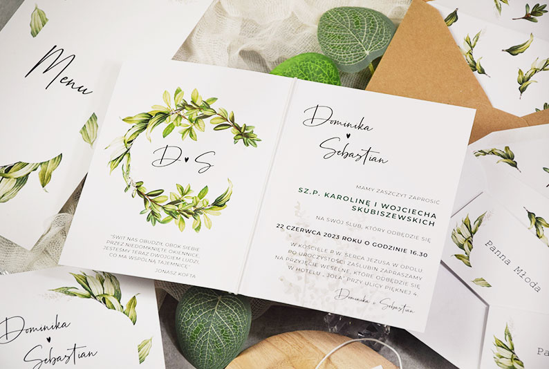 Całość stanowi zgrany komplet papeterii ślubnej.