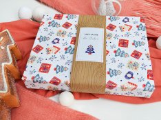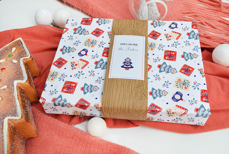 - pudełko z świąteczną grafiką ma wielkość 22,5 cm x 17,5 cm