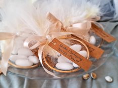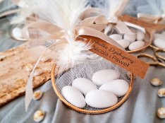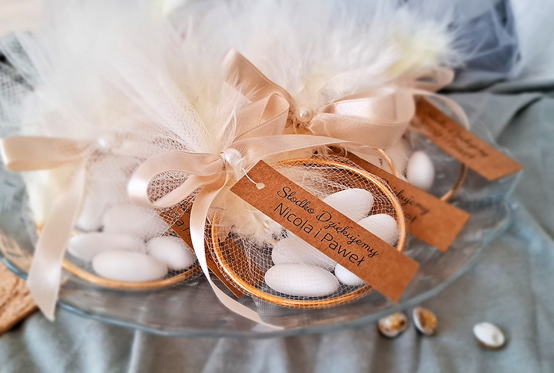 My proponujemy słodkie podziękowanie - migdały, pięknie opakowane w złotą obręcz, delikatny tiul i dopasowane dodatki.