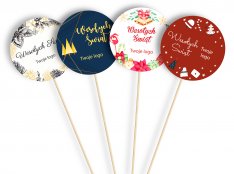 Flagetki bankietowe z logo firmy mocowane są na patyczkach i docierają do gości zapraszanych na przyjęciach.