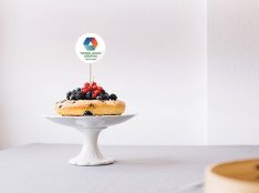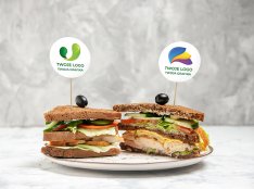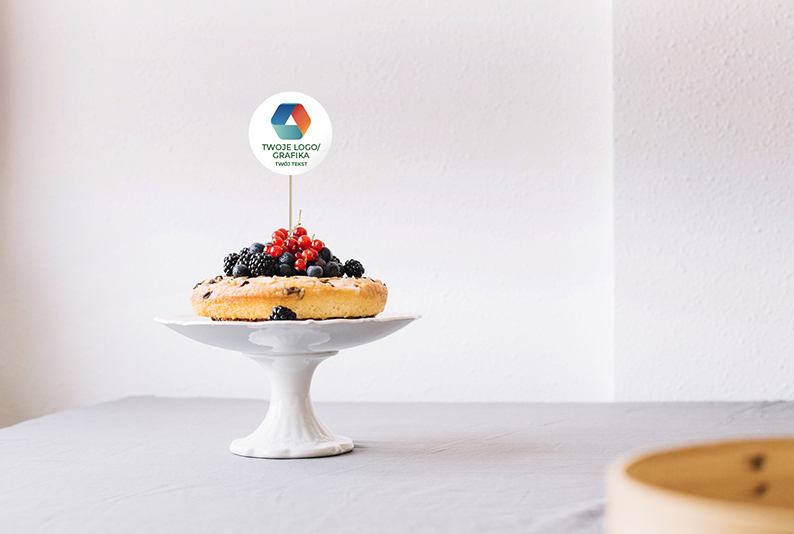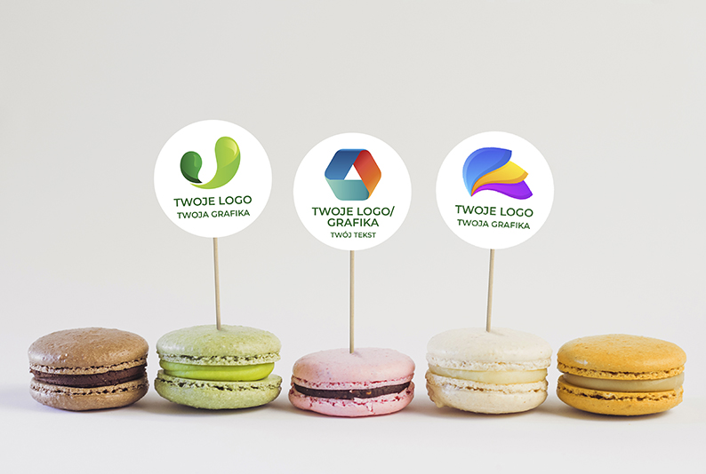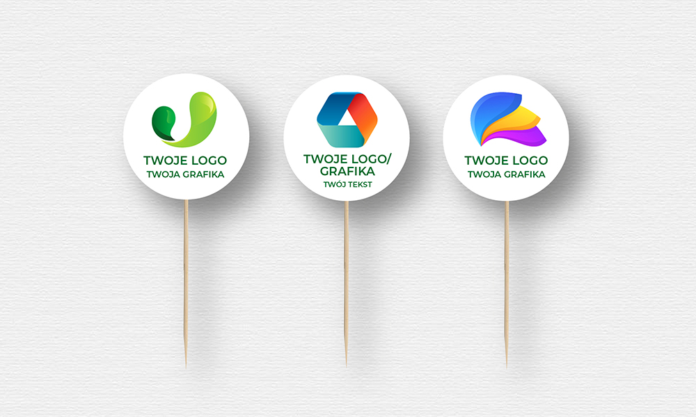 Flagetki bankietowe z logo firmy mocowane są na patyczkach i docierają do gości zapraszanych na przyjęciach.