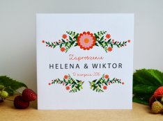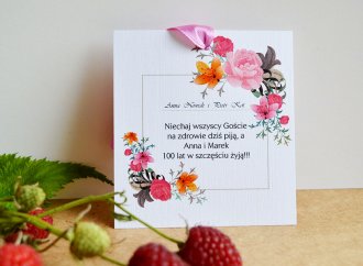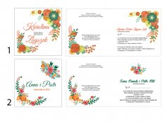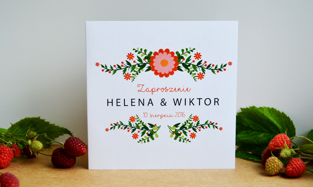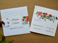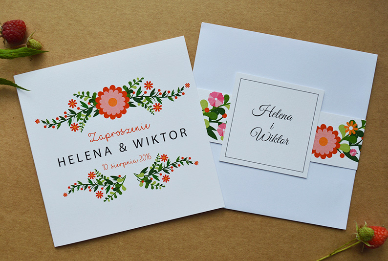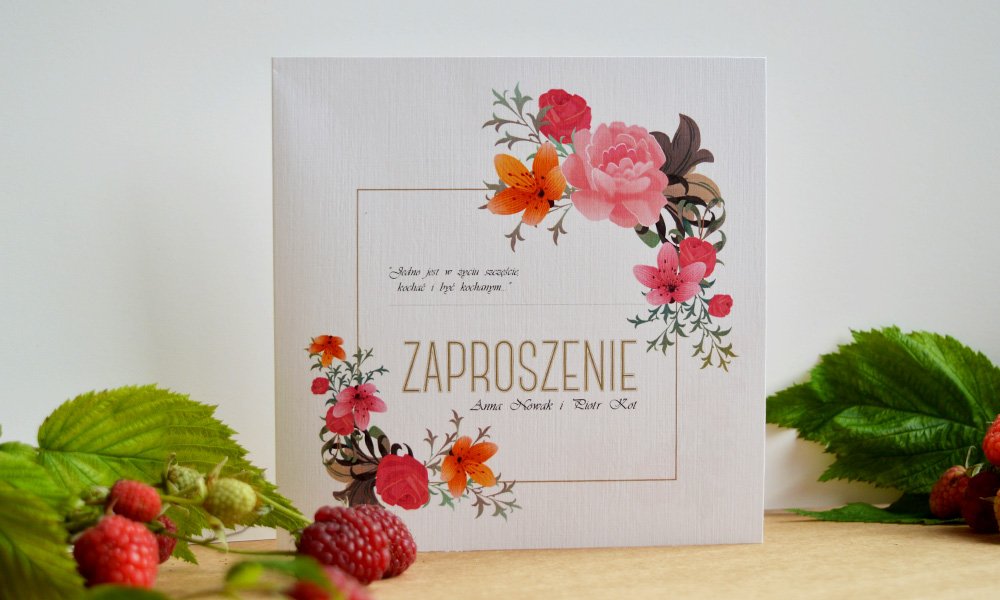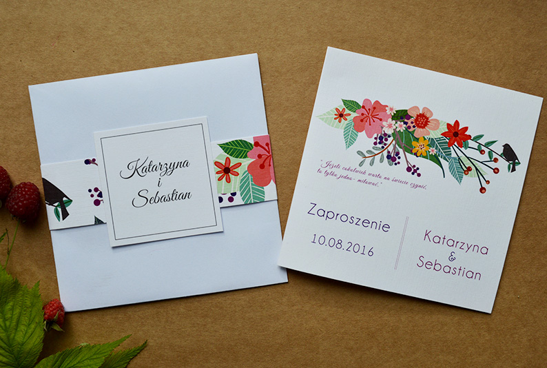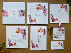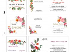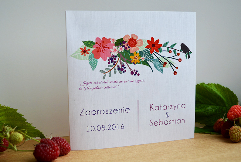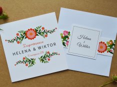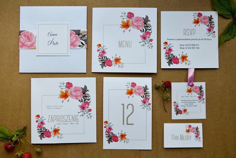 Motywem przewodnim zaproszeń są kwiaty wiśni i kontrastujące z nią kolory.
