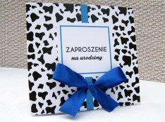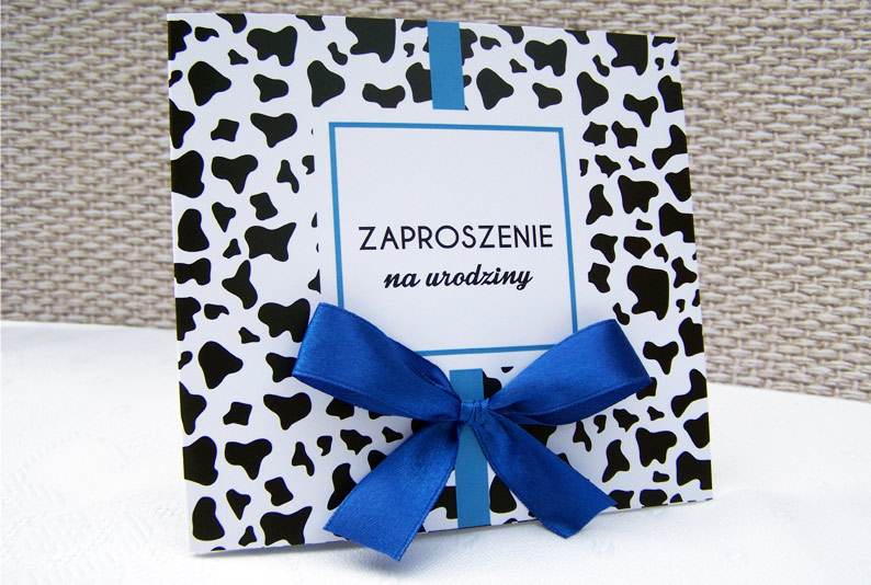 Zaproszenia Z ciekawym zadrukiem i z ozdobną kokardką.