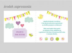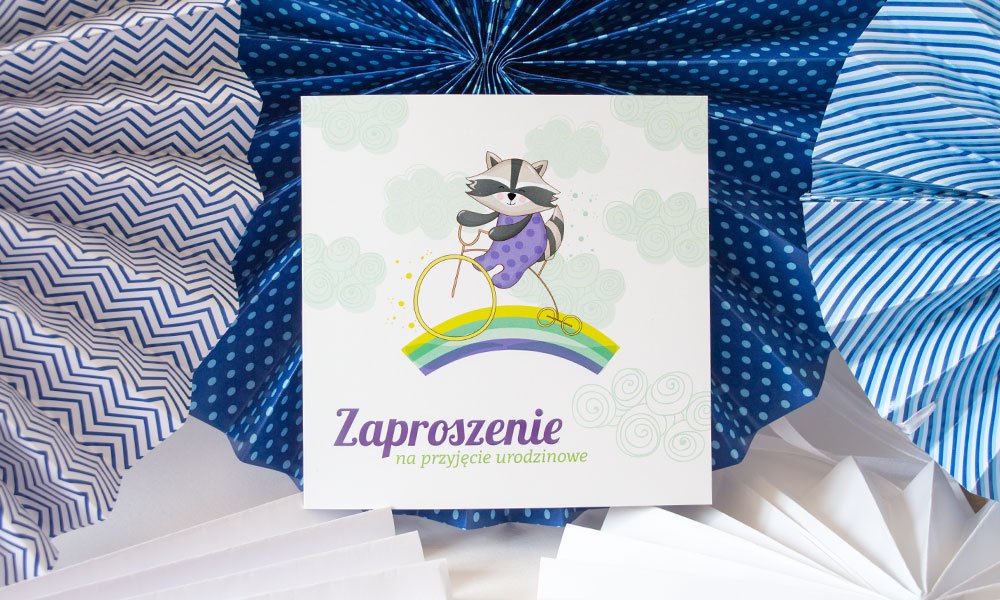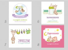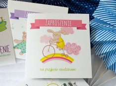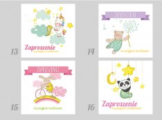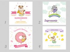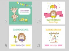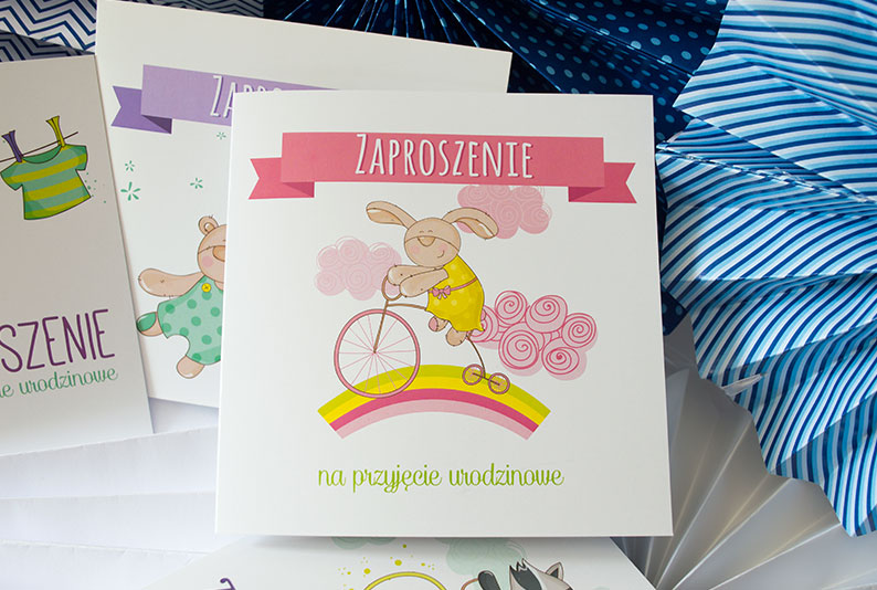 Motyw przewodni to grafiki w różnej stylistyce- zaproszenia z baletnicą, króliczkiem , misiem i koniem na biegunach.