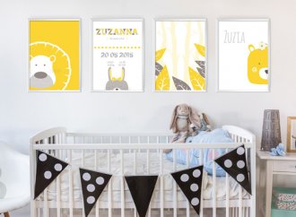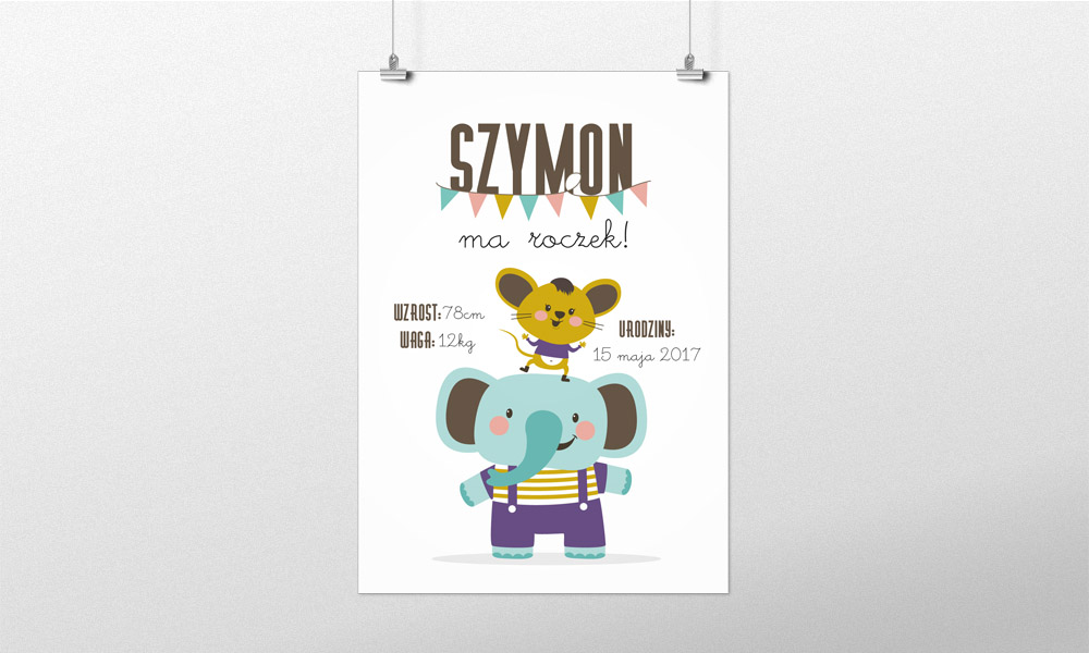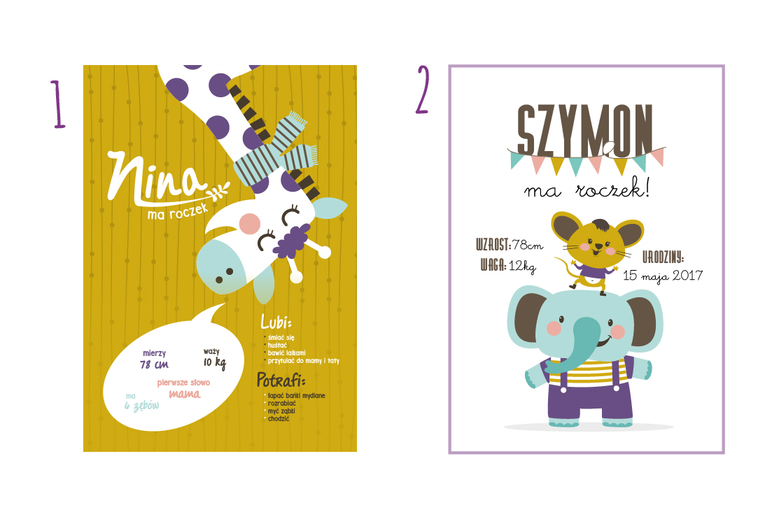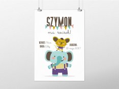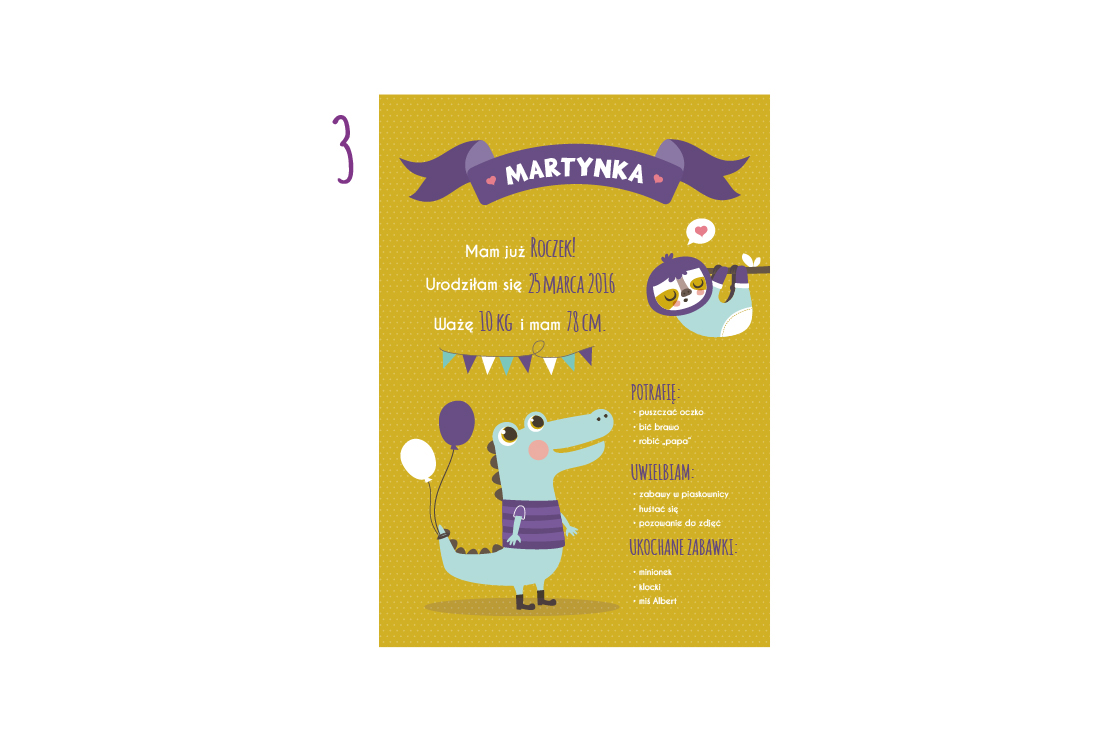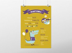 Plakat zawiera takie informacje jak: umiejętności dziecka; pierwsze słowa; ulubione jedzonko; ukochane zabawki itd.