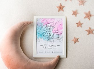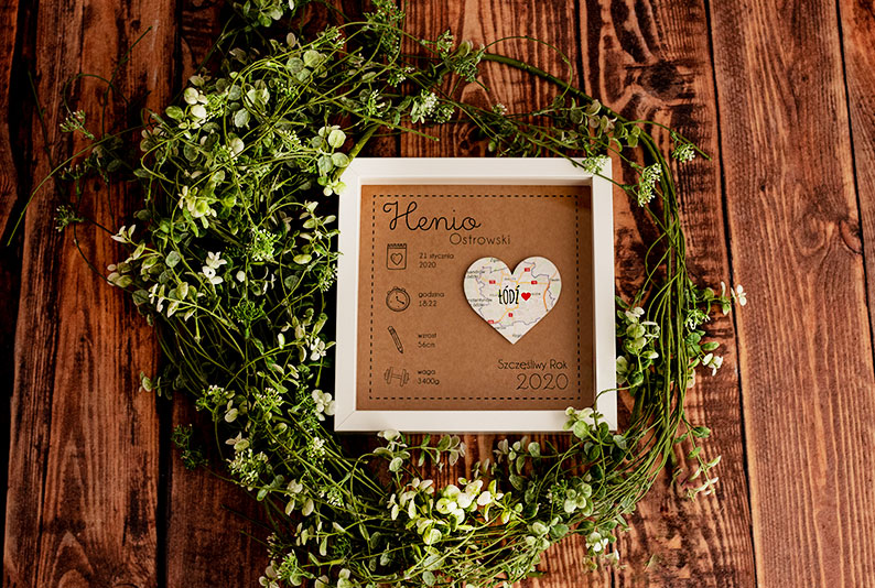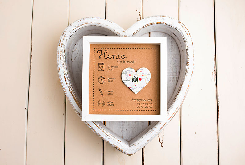 Mapka w kształcie serca pokazuje miejsce urodzenia maluszka.
