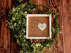 Nowoczesny styl i grafika to zaleta metryczki z sercem.