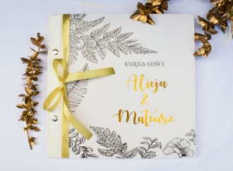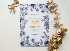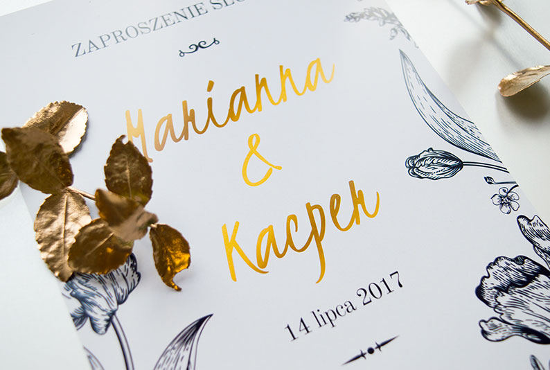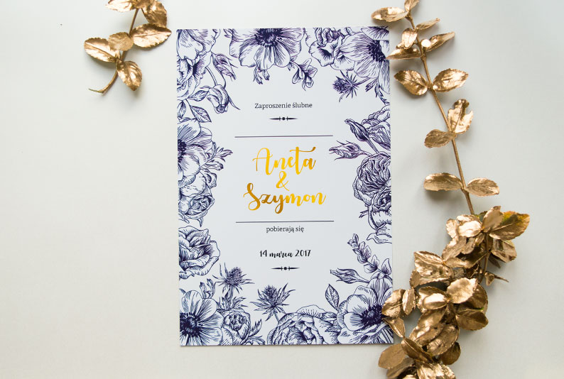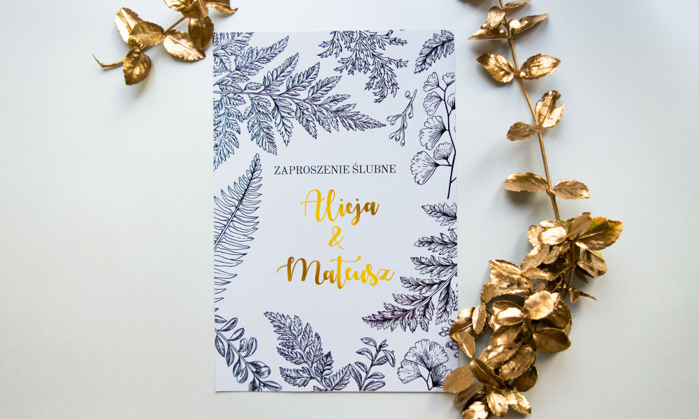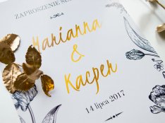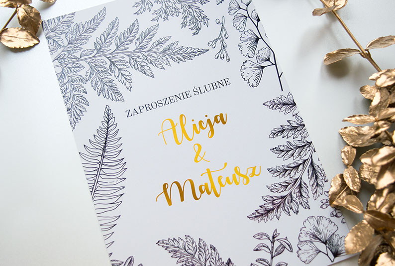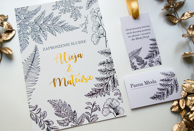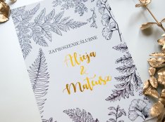 Piękne zaproszenia tworzy prostota w formie i kolorystyce połączona z bogatą grafiką. Całość rozświetla kaligrafia przypominająca kolor złoty.