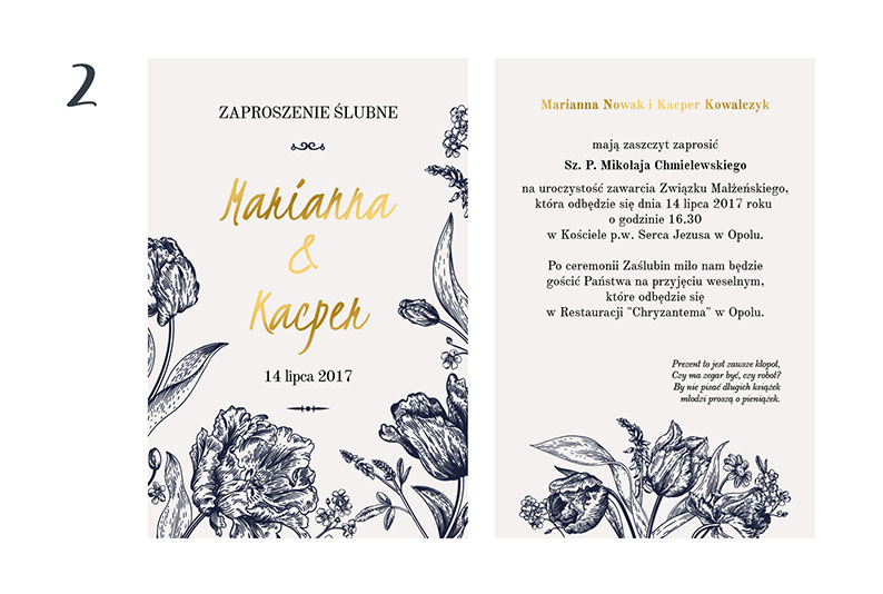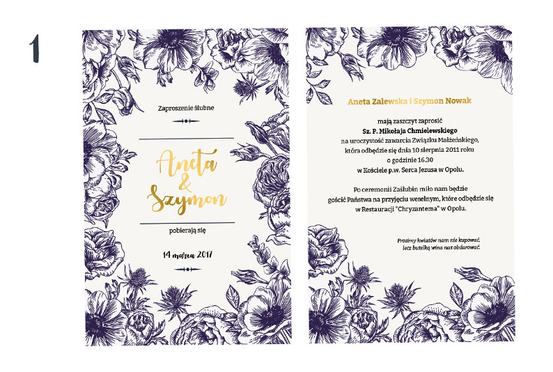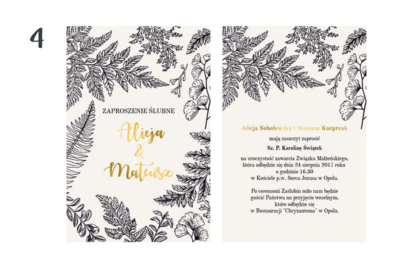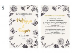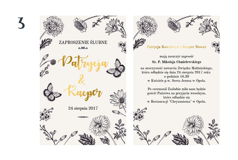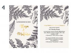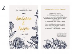 Kolorystyka i grafika zaproszeń na okładce jaki i w środku zaproszenia jest niezmienna oprócz elementów spersonalizowanych.