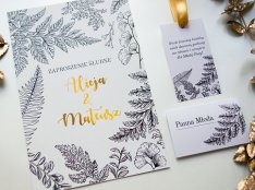 Do zaproszeń wykonaliśmy dodatki w tej samej stylistyce - motyw botaniczny jest obecny w zawieszkach i winietkach.