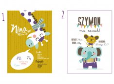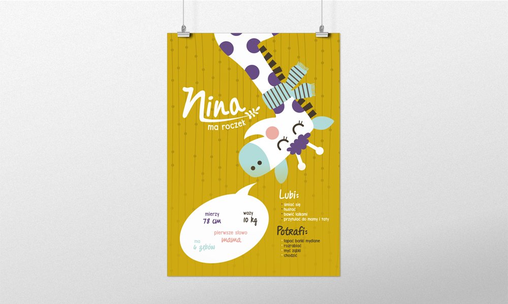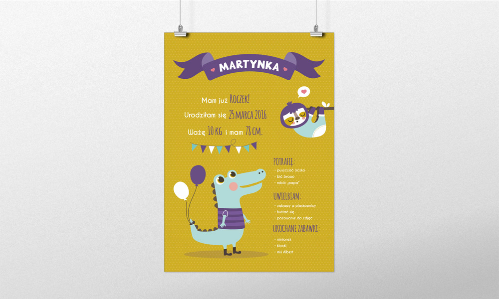 Plakat zawiera takie informacje jak: umiejętności dziecka; pierwsze słowa; ulubione jedzonko; ukochane zabawki itd.