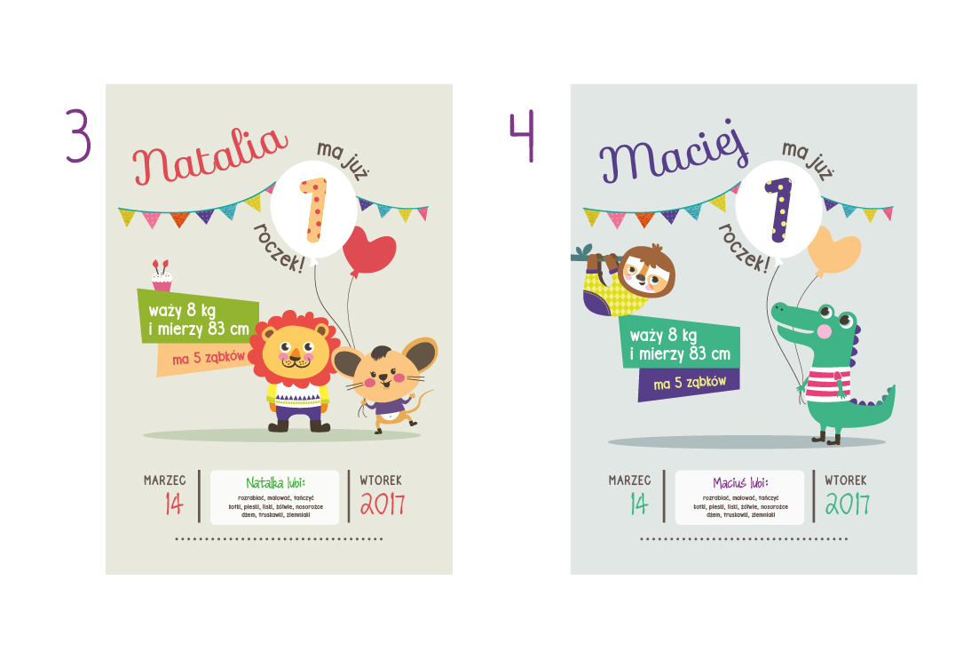 Plakat zawiera takie informacje jak: umiejętności dziecka; pierwsze słowa; ulubione jedzonko; ukochane zabawki itd.