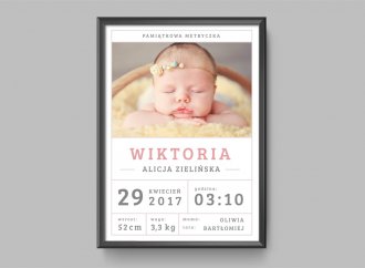 Nowoczesny styl; ciekawa grafika i lekka forma to cechy naszej metryczki ze zdjęciem.