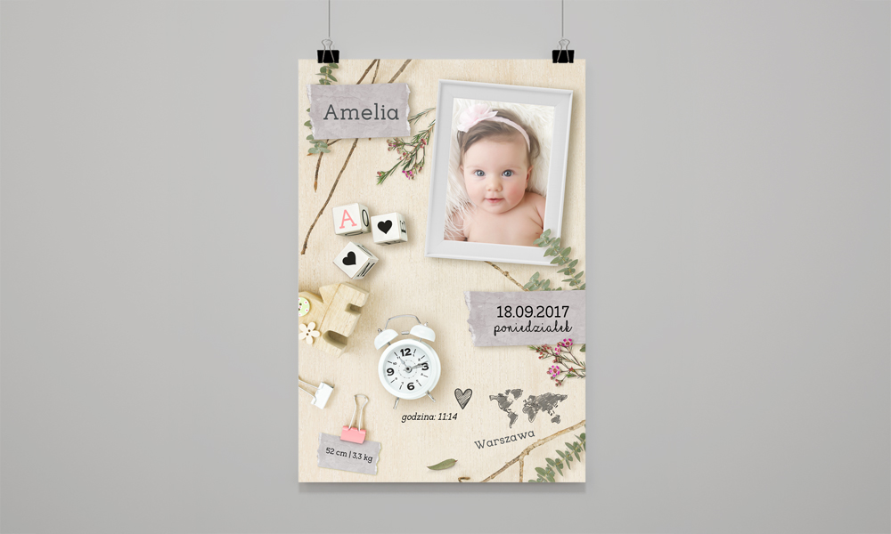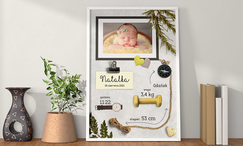Metryczka z ciekawą grafiką ozdobi każdy dziecięcy pokój i będzie wspaniałą pamiątką.